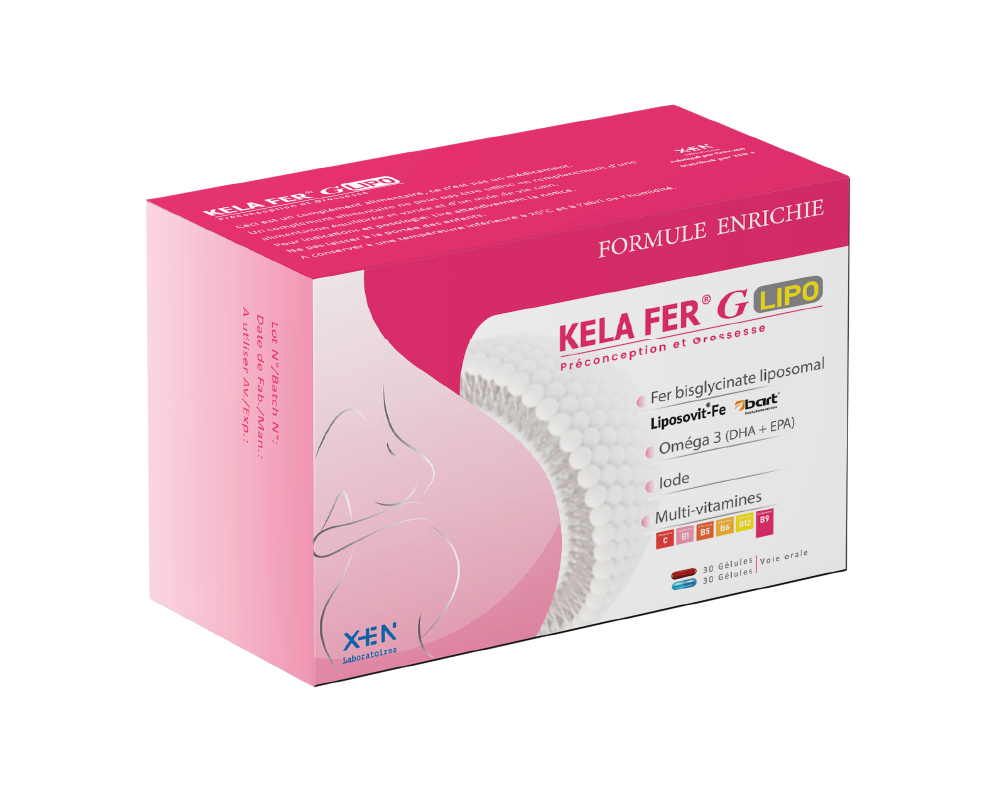 Kela Fer GLipo is a dietary supplement containing chelated iron bisglycinate, omega-3, and the vitamin B complex (B1, B5, B6, B9, B12). It is tailored to meet the specific nutritional needs of women from the time they wish to conceive, during pregnancy, and up to the first trimester of breastfeeding. It provides the necessary nutrients for the harmonious development of the fetus.