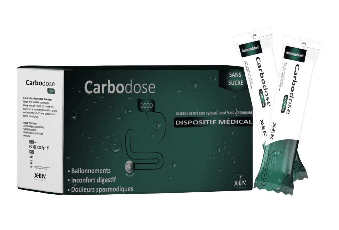Carbodose 1000 est un dispositif médical de classe Ila, sans sucre, préconisé pour soulager les symptômes des états dyspeptiques (digestion difficile, les spasmes digestifs, ballonnements et/ou émission de gaz).