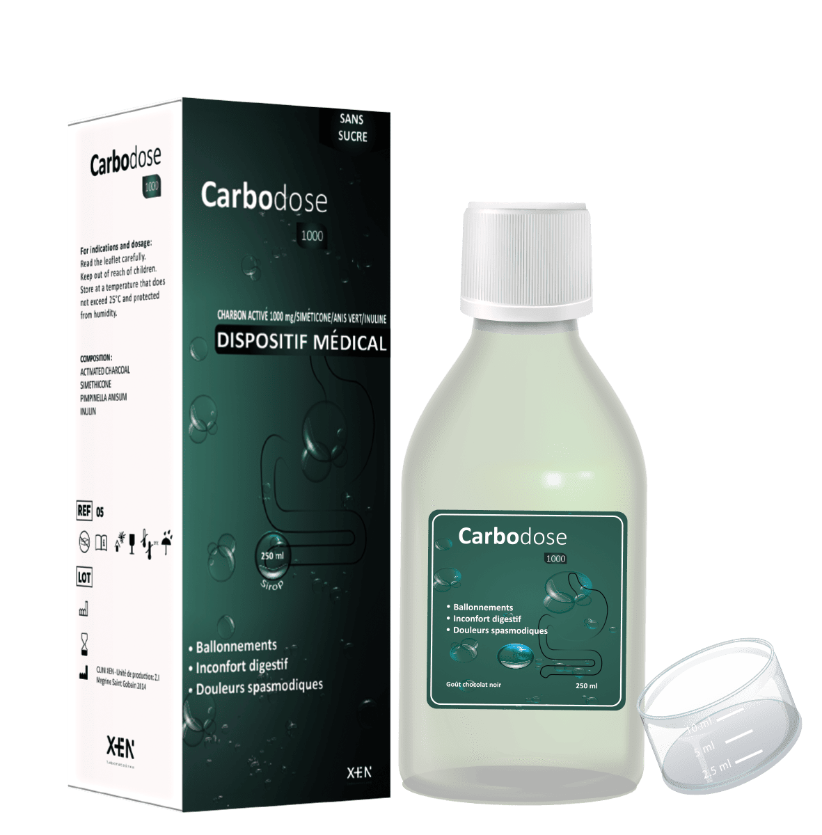 Carbodose 1000 est un dispositif médical de classe Ila, sans sucre, préconisé pour soulager les symptômes des états dyspeptiques (digestion difficile, les spasmes digestifs, ballonnements et/ou émission de gaz).